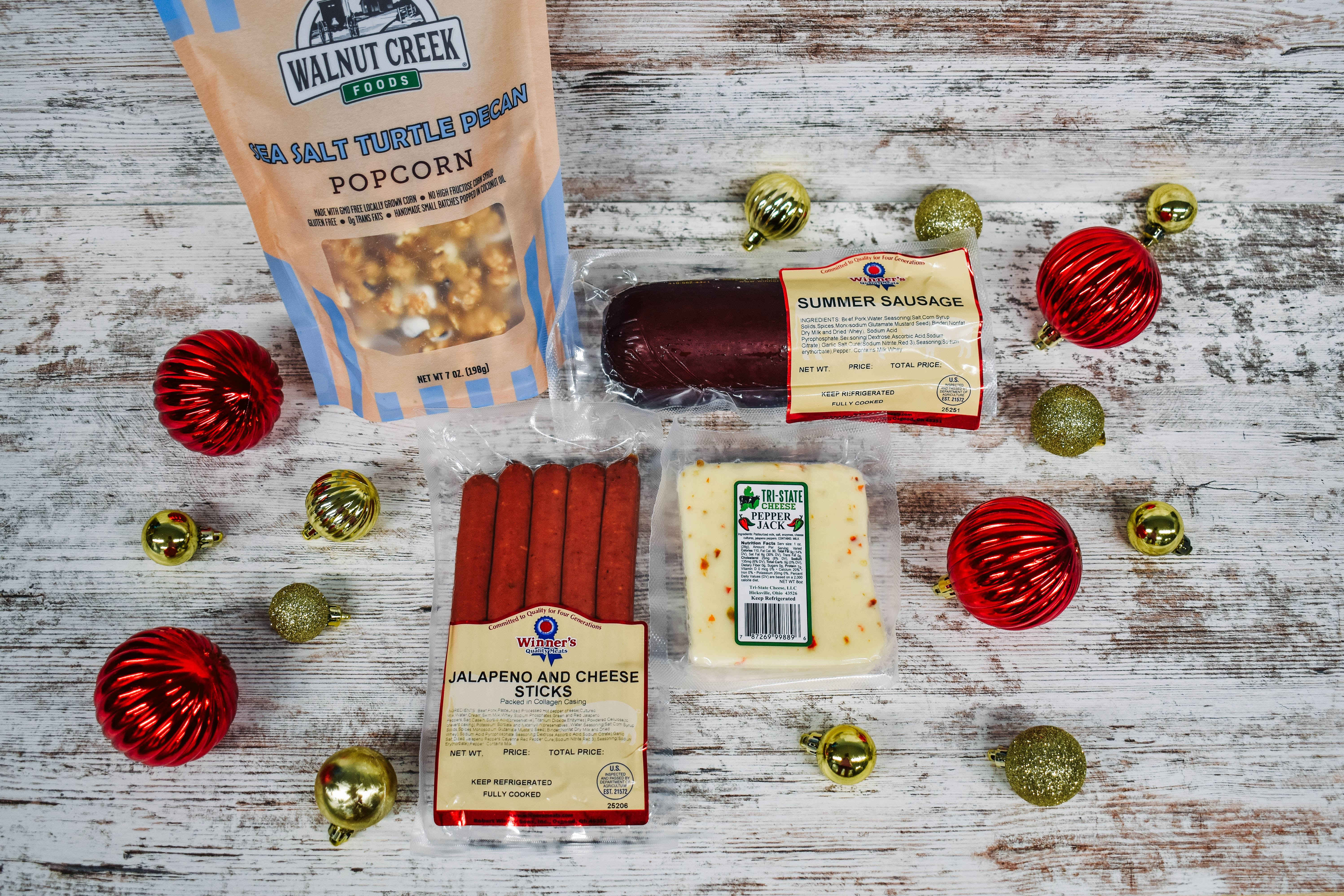 Holiday Meat Box 4 offers a perfect mix of savory snacks for any Christmas gathering. It includes a 24 oz. Summer Sausage, a package of Snack Sticks (choose from Smoky, Cheese, or Jalapeño Cheese), 7 oz. of Walnut Creek Specialty Popcorn, and two 8 oz. Cheeses (Colby Jack and Hot Pepper). Whether you’re hosting a holiday party or looking for the perfect Christmas gift, this box provides a variety of delicious flavors that will please everyone.