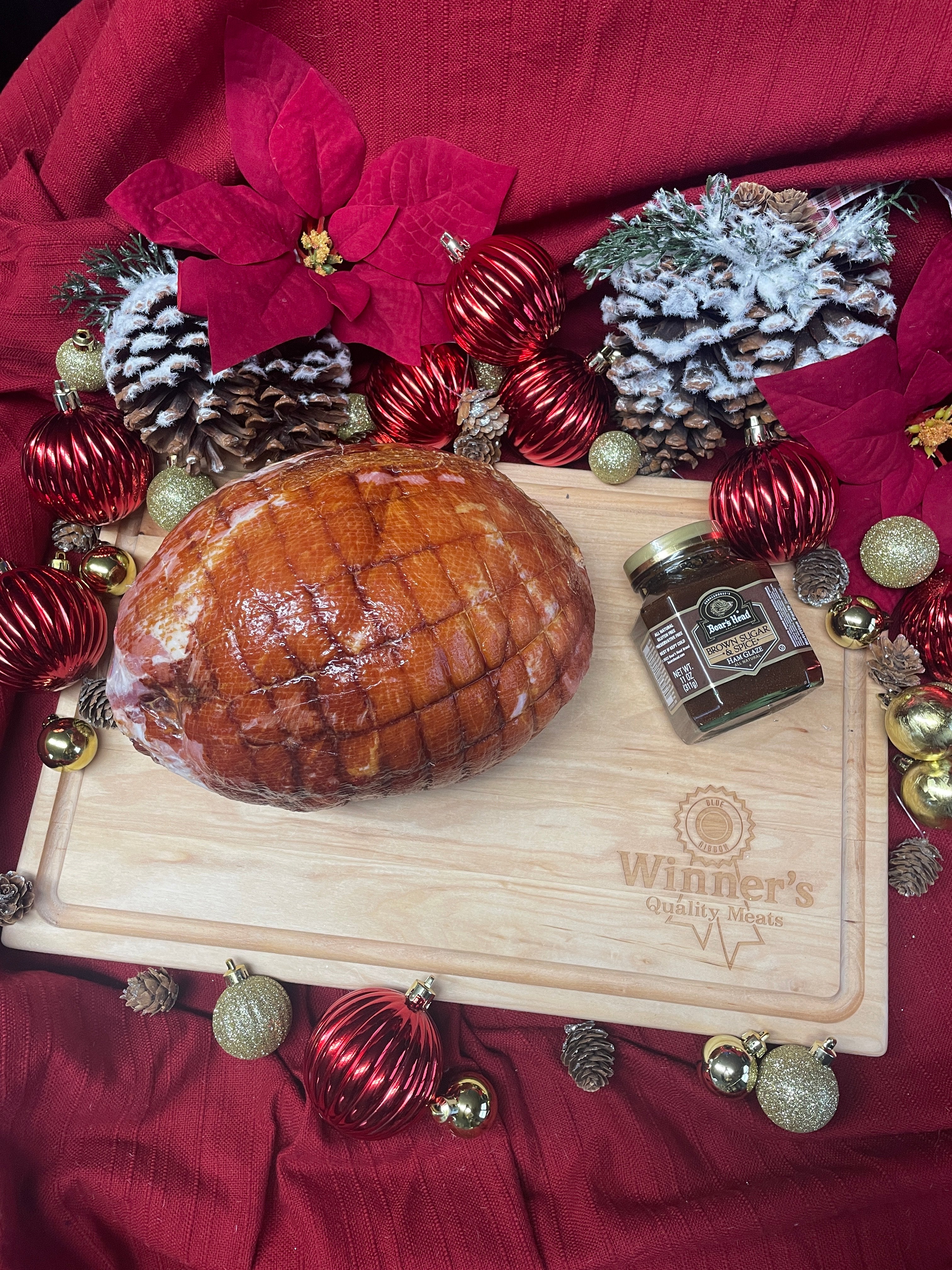 Make your Christmas dinner unforgettable with the Holiday Ham Gift Box, which includes an 8 lb. (approx.) fully-cooked boneless Hickory Smoked Ham and an 11 oz. jar of Brown Sugar and Spice Glaze. This rich, smoky ham is complemented by the sweet glaze, making it the perfect protein for your Christmas meal.